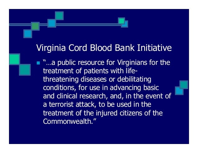 There is hereby established the Virginia Cord Blood Bank Initiative hereinafter referred to as the Initiative as a public resource for the treatment of patients with life-threatening diseases or debilitating conditions for use in advancing basic and clinical research and in. ZOnly 5 of umbilical cord blood is now being banked in Virginia by public institutions zPrimarily used by pediatric oncologists for childhood cancers zMost stored cord blood is being deposited in private storage facilities. Our Public Banking Program.